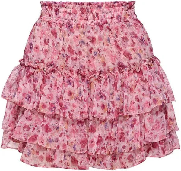 Show just the right amount of leg in this fit flattering mini. Featuring a tiered ruffled skirt with a smocked elastic waistband. Pull-on styling. Fabric: 100% Poly Chiffon. Fully lined. Dry clean. True to size. Model is 5'9" wearing size XS. Approx. 14" Length. Made in USA.